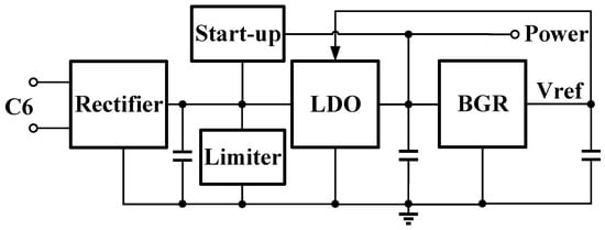 The energy extraction circuit is responsible for converting the C6 signal, which is separated from the interface circuit, into a stable DC power supply. The diagram is depicted in Figure 3. Initially, the rectifier completes the AC–DC conversion of the C6 signal, followed by the use of a low dropout regulator (LDO) and a bandgap reference (BGR) circuit, to further stabilize the output.