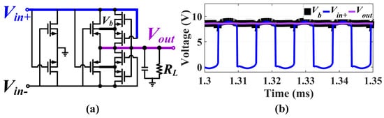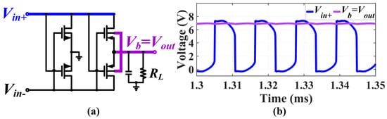 We employed a substrate adaptive rectifier, as illustrated in Figure 5a. We designed a substrate adaptive circuit for the PMOS that allowed its substrate voltage to be chosen between and . This ensured that the substrate voltage was always at the highest voltage, as shown in Figure 5b, thereby reducing the substrate leakage current of the PMOS, maintaining stable impedance matching, and improving the output power of the rectifier.