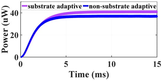 As shown in Figure 6, the simulation results of the rectifier’s output power demonstrated a 10.8% increase after the addition of the substrate adaptive circuit.