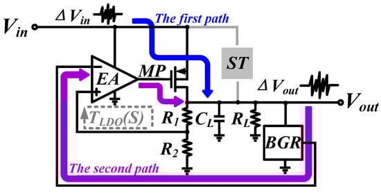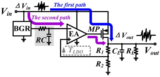 Figure 7 illustrates a conventional regulator, in which provides power to both the BGR and the error amplifier (EA), followed by the BGR supplying a reference voltage to the LDO [,,]. When a ripple occurs on , it will propagate through two paths to . The first path is through the LDO comprising the EA and MP, while the second path is through the BGR, before being input into the LDO, to reach . Therefore, is