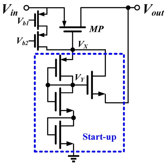 Firstly, there is the issue of system startup. When the input voltage is first connected, the BGR has no output voltage, preventing the LDO from starting. To address this problem, a fast start-up circuit (ST) is added, to provide an initial power supply voltage for the BGR. Figure 11 depicts the starting circuit of this design. When the circuit is turned on, increases, and the voltage at other points is 0. Each transistor is in the off state, and the voltage is pulled up. When exceeds the of the three transistors, is pulled up, and then MN is turned on, and is connected to . Then, the BGR starts to provide a reference voltage to the LDO, and the entire system enters normal operating mode.