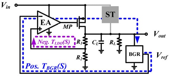 Next is the issue of system stability. Figure 12 illustrates the two loops in the system. The loop TBGR (S) generated from to is unique to the proposed structure. In this structure, the BGR is supplied by the stable output voltage of the LDO, resulting in a more stable output voltage of the BGR. Additionally, the reference voltage of the LDO is supplied by the BGR, creating a positive feedback loop that further stabilizes . However, a large interference in the circuit or a significant change in the LDO output load can also cause to deteriorate, due to the positive feedback loop. Fortunately, the system also features another feedback path, TLDO (S), which is the inherent negative feedback loop responsible for ensuring the LDO’s functionality. The system will remain stable as long as the negative feedback loop gain in the system exceeds the positive feedback loop gain.