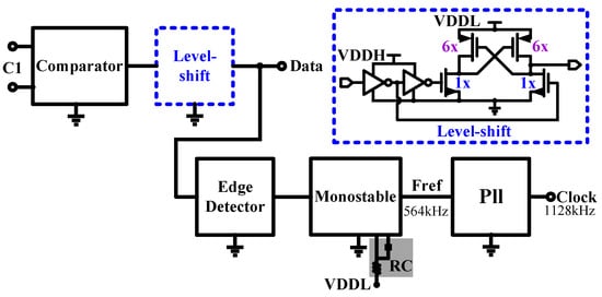 Figure 13 shows the block diagram of the clock data recovery circuit. The differential signal C1 is fed into the comparator and level shift circuit, which outputs single-ended data to the passive balise. The level shift circuit reduces the voltage level, thereby decreasing the power consumption of the subsequent circuit. When designing the level shift circuit, it is important to adjust the width-to-length ratio of PMOS and NMOS to 6x and 1x, respectively, which can improve the speed of shifting.
