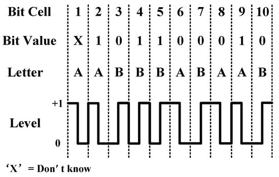 The data are encoded using the differential bi-phase-level(DBPL) code [], and its coding rules are depicted in Figure 14. Each bit is represented by two states. The first state indicates a phase change, transitioning from +1 to 0, denoted as ‘A’, and from 0 to +1, denoted as ‘B’. The second state is used to compare the current symbol to the previous symbol, with equality represented as ‘1’ and inequality represented as ‘0’. We can utilize the edge extraction circuit and the monostable trigger to extract the clock information. By adjusting the transient state of the monostable trigger through changes in the size of R and C, we can convert the data code, which has a mean rate of 564.48 Kbit/s, into a clock with a mean rate of 564.48 KHz. This clock serves as the reference frequency for the phase-locked loop (PLL), which ultimately generates the required system clock output.