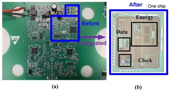 Figure 15a shows the balise built with discrete components, with the active balise highlighted in the blue box. Based on the integration approach described in Section 2, the integrated active balise designed in this study is shown in Figure 15b. By integrating all the components within the blue box in Figure 15a into a single chip, the use of discrete components was reduced by 25%.