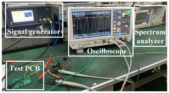The environment of the test and the photo of the test printed circuit board (PCB) are shown in Figure 16. A signal generator generated the input signal. An oscilloscope was used to observe the waveforms at the output points of the energy extraction circuit, while a spectrum analyzer was used to analyze the output of the clock recovery circuit.