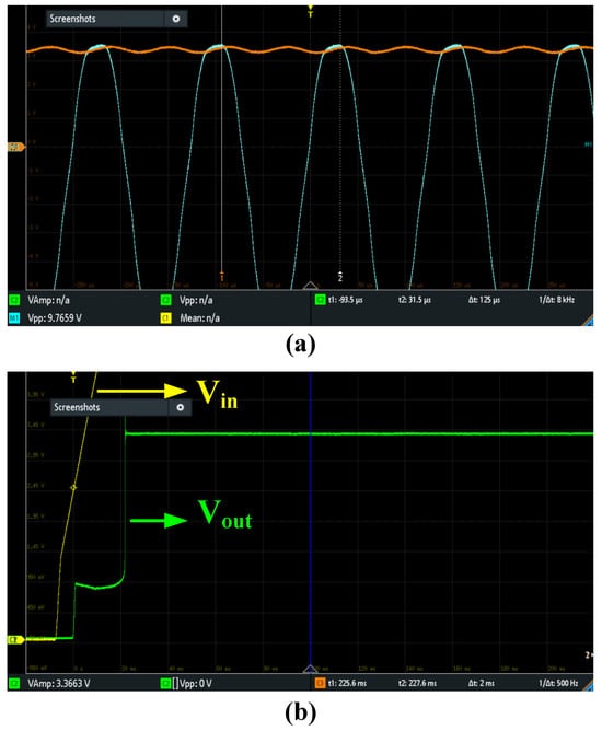 Using an oscilloscope, we displayed the and of the substrate-adaptive rectifier, as shown in Figure 17a. The input signal was generated by a signal generator and was a sinusoidal waveform with a peak-to-peak value of 20 V. According to the results, it can be observed that the output voltage of the rectifier remained stable at 9.76 V.