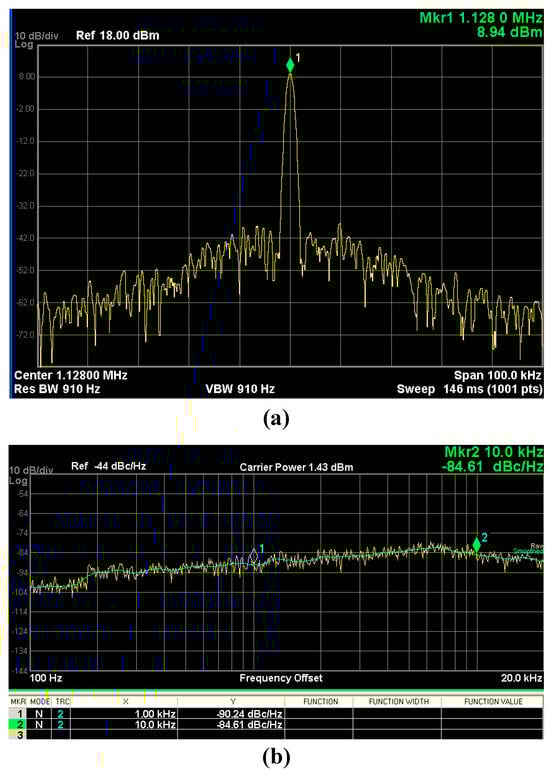 According to Section 2.2, the output of the clock recovery circuit should be a 1.128 MHz clock. We used a spectrum analyzer to show the spectrum and phase noise of the output signal from the clock recovery circuit. Figure 18a displays the spectrum of the output clock, indicating that the output clock remained stable at 1.128 MHz. We further tested the quality of the output clock through phase noise analysis, as shown in Figure 18b. We analyzed the phase noise at two points, 1 KHz and 10 KHz offset from the 1.128 MHz output clock, respectively. The results indicated that the phase noise of the output clock was less than −80 dbc/Hz.
