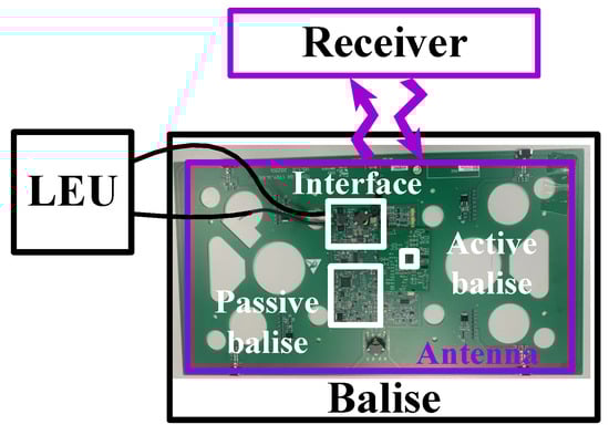 The BTS (balise transmission system) is widely used in the CTCS (Chinese train control system) and the CBTC (communication-based train control system), as shown in Figure 1a [,,,,,]. The system is composed of a BTM (balise transmission module), an antenna, an LEU (lineside electronic unit), a balise, cable, and the TCC (train control center). Figure 1b shows the structure block diagram of the BTS system. The BTM and antenna are onboard equipment. The balise (including an active balise and a passive balise), LEU, and TCC are ground equipment. The TCC will transmit a differential superposition signal to the balise through the LEU and the cable. The interface between the active balise and the LEU is called ‘C’. When the train passes, the passive balise is activated and then communicates with the BTM through the antenna.