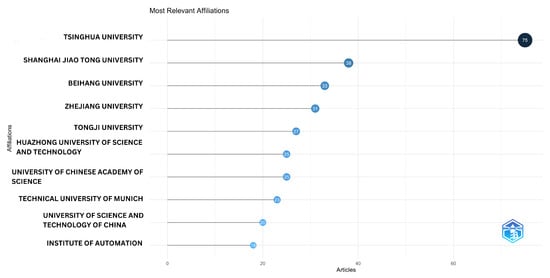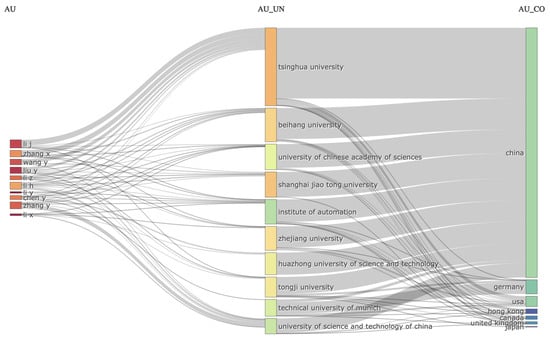 An analysis of the most relevant affiliations was also conducted to illustrate this and extract interesting statistical information. This analysis was based on the total number of articles produced by different universities to which the aforementioned authors belong to. According to Figure 1, Tsinghua University is by far the most productive institution, given the fact that it is responsible for the largest number of publications, which is 75. Tsinghua University produced almost twice as much work as the second-ranked Shanghai Jiao Tong University, which produced 38 papers. The rest of the displayed universities have been involved in at least 20 works. It is to be noted that the universities with the highest production are mostly Chinese. Figure 2 is a 3-field plot linking the 10 most relevant affiliations from the middle field to the countries where they are located on the right field along with the authors related to them on the left field.