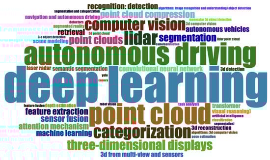 By analyzing the frequency of the author’s keywords, the investigators noticed that the most used words regarding this topic are DL, autonomous driving, and point clouds. Point clouds are inextricably linked to 3D object detection due to their ability to accurately represent spatial information in 3D space. They are frequently derived from LiDAR sensors and act as an accurate representation of the real-world scene in applications such as robotics and autonomous driving. Point clouds are crucial components of 3D object detection pipelines because they allow for precise localization and feature extraction and are compatible with DL methods.