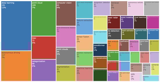 Table 4 contains the top 10 most frequent words used by authors and their respective number of occurrences. When it comes to 3D object detection, DL represents a key element of the topic. Autonomous driving, point cloud, and LiDAR are apparently some of the main manifestations of 3D object detection’s utility. Moreover, Figure 4 depicts a TreeMap containing possible combinations that represent 3D object detection.