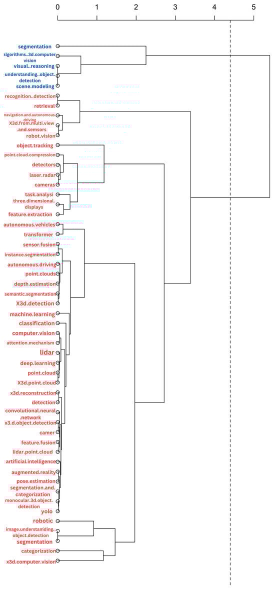 In order to explore the underlying relationship between the author keywords, a hierarchical clustering was performed (Figure 5). Hierarchical clustering offers a valuable approach for detecting and analyzing the intricate structures within the data [13]. As displayed, there are two main blocks to be examined. The first block highlights the association between segmentation and CV algorithms related to visual reasoning, object recognition and understanding, and scene modeling. The second block has far more splits and therefore can be useful in identifying a wide range of areas of interest. The terms detection, recognition, and retrieval are clearly related to interesting subjects such as Autonomous Driving and Robot Vision. Object Tracking seems to be correlated with point cloud compression techniques. These techniques are coupled with detectors such as laser radars and cameras. Three-dimensional displays and feature extraction techniques are part of task analysis for object tracking. The next block features the terms autonomous vehicles and transformer in relation to two main strands. Number 1 is sensor fusion and instance segmentation in autonomous driving in relation to point clouds for depth estimation, which involves semantic segmentation and 3D detection. Number 2 is mainly Machine Learning for classification divided into CV coupled with attention mechanisms and the terms 3D construction and detection. The terms recognition and understanding associated with object detection and the term segmentation are part of the discussion about robotics in correlation with categorization coupled with 3D CV.