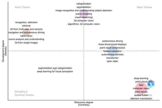 The analysis of the author’s keywords continued while attempting to uncover the conceptual structure of the field. It was possible to identify the four categories of themes: basic, motor, niche and emerging/declining themes. The most relevant and basic theme is DL, followed by point clouds and LiDAR technologies. The topics that are currently highly developed but only moderately relevant are categorization, segmentation, and image recognition and understanding for object detection. Some concepts are only fairly developed; however, their relevance is quite significant compared to the previously mentioned ones, autonomous driving, and 3D displays.