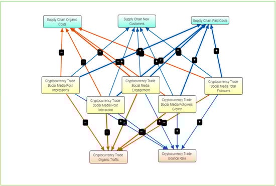 In the present section, the authors emphasize on is the representation of the relationships among the study’s variables. To perform this task, the Fuzzy Cognitive Mapping (FCM) procedure is discerned for its usage. Through the presentation of the relationships deployed among the study’s variables, a more coherent understanding can be made, through elaborating on the connection between supply chain firms and DeFi platforms’ social media analytics. To deploy the model, the authors utilized the online platforms of MentalModeler [] and produced the model presented in Figure 1. The produced FCM model aids the process of extracting important insights from the variables’ relationships. FCM depicts the static relationships of the model’s variables and their intercorrelations []. In this context, multiple applications of Fuzzy Cognitive Mapping processes have aided in the solution of various decision-making problems in various fields [].