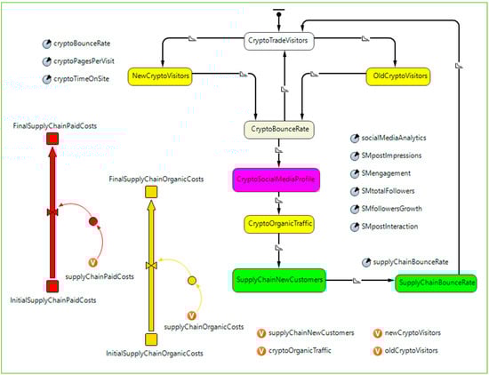 Aiming to simulate the impact of DeFi platforms’ social media on supply chain firms’ key digital marketing and financial KPIs, the authors deployed a Hybrid Model (HM) [], consisting of both Agent-Based (ABM) and System Dynamic (SD) models. The simulation process of the HM was reinforced by inserting the coefficients of the correlation and SLR analyses. The simulation time of the Hybrid Model was set to 360 days to capture the whole fluctuations of the variables throughout the year. The Decision Support System (DSS) utilized for the deployment of the Hybrid Model is the Anylogic software []. More specifically, the authors seek to model the variation in supply chain firms’ new customers, organic and paid costs, as well as DeFi platforms’ organic traffic and bounce rate, through the fluctuation of DeFi social media analytics. For the ABM model, 10,000 agents were used to simulate the online behavior of supply chain and DeFi websites and social media platform visitors.