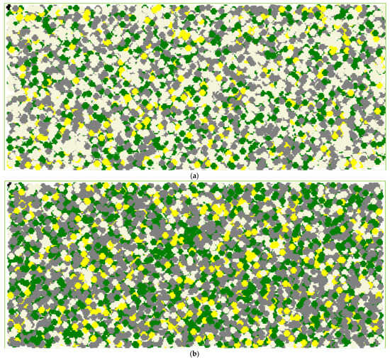 During the simulation of the DeFi platforms and supply chain firms’ analytical metrics, the allocation of the Agent-Based Model’s (ABM) agents was performed. This allocation is based on the statecharts each agent manages to reach through the 360-day simulation period. So, in Figure 3a,b, we can see the allocation of 10,000 agents, during the simulation of DeFi social media usage. In the first Figure 3a, a limited usage of DeFi social media by their website visitors, leads to a reduced number of yellow and green agents, while the number of beige-colored agents is increased. Gray color represents the agents that do not land on DeFi websites, beige colors the agents that land on their websites and abandon them right after, while yellow and green color represent agents that contribute to DeFi platforms’ organic traffic, as well as supply chain firms’ new visitors/customers. After increasing DeFi social media usage, in Figure 3b, we can discern increased numbers of green-colored agents, with yellow-colored agents remaining the same, while the number of beige-colored agents has decreased. It becomes clear that increased usage of DeFi social media from their website visitors does not seem to increase their organic traffic, but on the contrary, it increases the amount of potential website visitors and customers of supply chain firms that could collaborate with them.