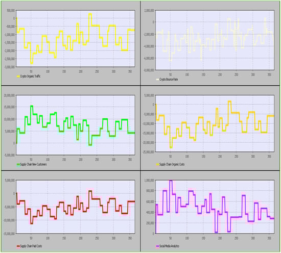 Based on the outcomes of the simulation analysis, the variation through the 360 days indicated some important outcomes concerning the variation in DeFi platforms’ organic traffic and bounce rate, as well as supply chain firms’ new customers, organic, and paid costs are presented in Figure 4. From the comparison of the referred variables’ variation through time, with DeFi social media analytics, we can generally observe that shortly after every increase in the DeFi social media analytics’ values, their organic traffic decreases, and their website bounce rate decreases also. At the same time, supply chain firms’ organic and paid costs are being reduced shortly after, while their new customer metric increases. The opposite happens to the referred variables when DeFi social media analytics’ values decrease.