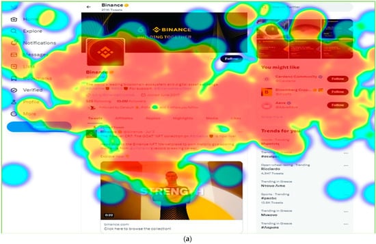 Reaching the cognitive neuromarketing model of the study, the authors aim to evaluate the responses of Decentralized Finance (DeFi) social media profiles’ visitors, measured in eye tracking observation, fixations, and gazes’ engagement, as well as the expressed emotions [,]. The assessment of the social media profile of Binance on Twitter was performed, where 21 participants were put to observe the referred Twitter profile for 30 s, with the usage of a web camera that records their expressions. From the deployment of the cognitive neuromarketing model, aggregated heatmaps and facial analysis images were produced by the total of the study’s participants. The observation of the social media profile of the DeFi profile was performed through the utilization of the Realeye [] decision support platform.