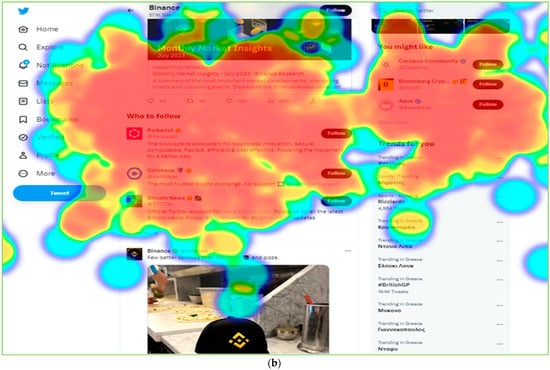 In Figure 5, the results of the aggregated heatmaps produced by the 21 participants of the neuromarketing model are presented. Figure 5a shows the first 15 s of the social media profile observation, where the areas of the profile the participants mostly noticed are mentioned with more intensity and interest (red color) []. The same applies to Figure 5b, where the aggregated heatmaps of the last 15 s are presented. From these figures, it can be discerned that the participants tended to focus more on the posts (videos/images or simple text) on the social media profile of the DeFi platform, as well as on the suggestions made to them regarding other social media profiles they might like or should follow. Little importance was given to the column with the trending tweets or news.
