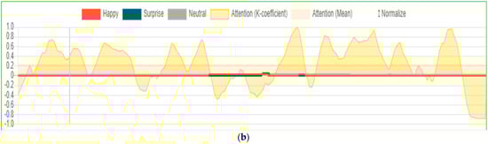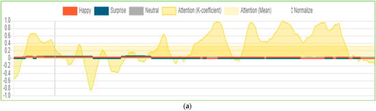 Referring to the aggregated facial analysis of the participants, we extracted the following graphs, presented in Figure 6, that show the attention and emotions allocation of the 21 participants. In Figure 6a, which indicates the first 15 s of the observation process, the participants had a quite high mean attention coefficient, with some increased parts of attention expression, while not expressing clear emotions of happiness and surprise. Whereas, in Figure 6b, at the last 15 s of the observation, the participants’ mean attention coefficient was reduced, despite the appearance of some peaks in their attention expression. Again, no clear indication of happiness or surprise emotional expression was extracted.