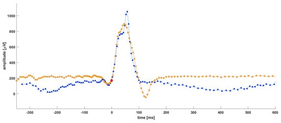An example of two electrocardiogram patterns (orange and blue) with the non-uniform grids (circles and triangles) aligned on their detection point (red) to .