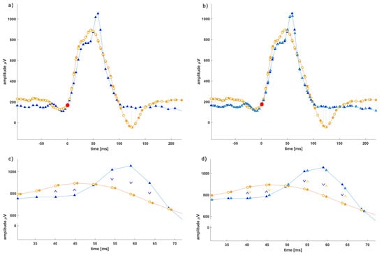 Calculating the similarity score with the Mutual Graph Approximation; solid circles are original samples of , solid triangles are original samples of , (a) approximation of values in time points where samples in occur (empty circles) allows to calculate distance to approximated , (b) approximation of values in time points where samples in occur (empty triangles) allows to calculate distance to approximated , (c) details of (a) in the time range 30–70 ms, (d) details of (b) in the time range 30–70 ms; ‘∧’ and ‘∨’ marks points where approximated values of the target graph were calculated according to the sampling grid of source graph.