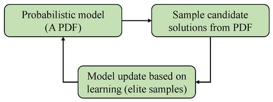 The CE optimization method follows a model-based search framework. In this approach, feasible solutions are derived from a parameterized probability distribution function (PDF), which is continually updated based on the elite candidates identified in the previous iteration. Probability distributions are commonly referred to as “models” in the literature [25]. An elementary schematic diagram illustrating the CE search framework is presented in Figure 1. In essence, the cross-entropy (CE) method relies on a predefined PDF (model). The overall process can be concisely described as an iterative sequence encompassing the definition of a model, the sampling of data from that model, learning from the sampled data, and subsequently updating the initial model.