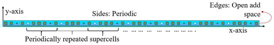 We construct an equivalent 1D metasurface model, which corresponds to the highlighted section in red in Figure 2. It has the same x-axis dimension (L = 345 mm) as the original metasurface aperture and a y-axis dimension (W = 7.5 mm) as small as the dimension of the constituent unit cell. Appropriate boundary conditions are assigned to the 1D metasurface model in the CST-MWS time-domain solver to emulate the response of a full metasurface (“E(t) = 0” along the y-axis and the “Open Add Space” boundary condition along the x-axis, as depicted in Figure 3. Despite the simplification, the structure retains a high mesh complexity (exceeding 800,000 hexahedrons), necessitating the avoidance of batch processing.