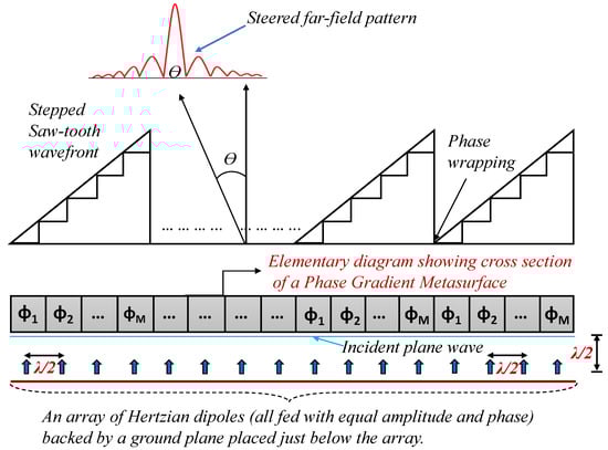 The illustration depicts an array feed situated at a half-wavelength distance beneath the metasurface, giving rise to a plane-wave propagation along the z-axis. This feed encompasses an array of infinitesimal Hertzian dipoles spaced half a wavelength apart, all positioned in front of a ground plane. A uniform magnitude and phase are assigned to the feed’s elements. Each spatial phase-shifting cell within the metasurface introduces a specific phase modification, thereby establishing a consistent progressive phase disparity between adjacent cells. Consequently, the metasurface output assumes a continuous, linearly escalating phase profile. This phase profile, upon cycling every increment in the phase delay, transforms into a saw-tooth phase distribution. The unchanging phase difference between neighboring cells () remains constant, where M denotes the count of unique cells in the supercell (one period within a PGM is denoted as a supercell).