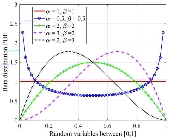 The process of optimizing the distribution of feed amplitudes constitutes a continuous optimization problem confined within a specific search space. By attributing distinct amplitude excitations to each element within the supercell, effective control over the sidelobe levels within the radiation pattern is achieved. The optimization parameters () are permitted to vary continuously within the interval of 0 to 1. To maintain adherence to this range, population candidates are sampled independently and identically (i.i.d) from a beta probability distribution function (), as shown in Figure 8, since it naturally supports the bound within [0, 1]. The initial distribution uses and .