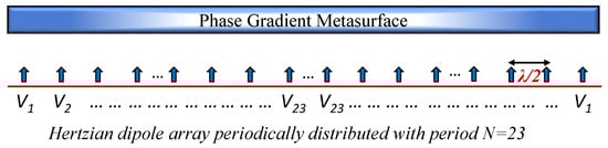 Antenna array theory has established that sidelobe levels (SLLs) can be controlled through customized amplitude distributions within the excitation field [36]. In our methodology, we harness this principle by supplying each element of the supercell with infinitesimally small Hertzian dipoles. Notably, distinct excitation amplitudes are assigned to each dipole element while maintaining a constant phase, as illustrated in Figure 7.