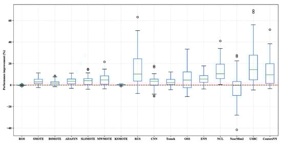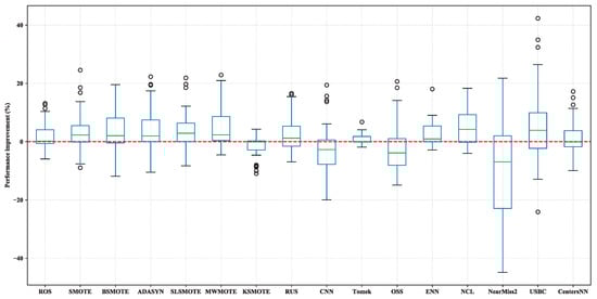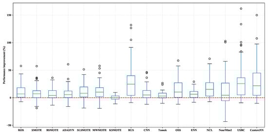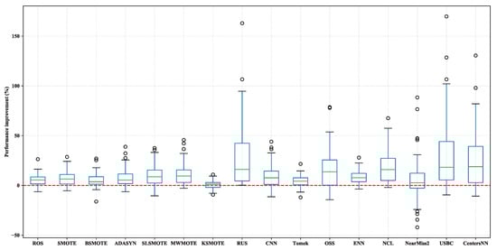 Figure 4 shows boxplots of the percentage performance improvement for all sampling methods over None with the ensemble learner RF. From Figure 4, it can be observed that all of the used sampling methods obtained median values larger than zero, which means that these 16 sampling methods usually performed better than None with RF as the classification algorithm.
