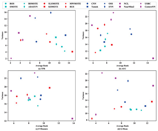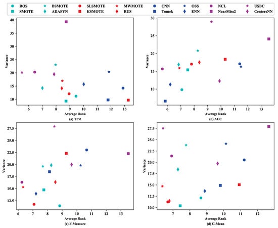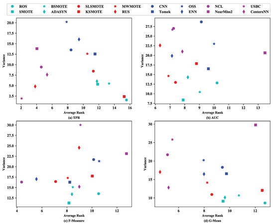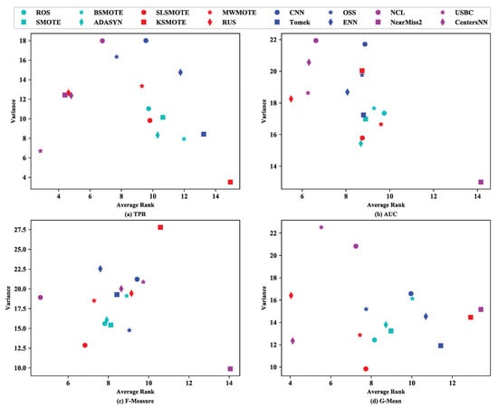 When using KNN for imbalanced data classification, the corresponding scatter diagrams were as presented in Figure 7. From Figure 7, it can be observed that when using TPR to evaluate the classification performance for imbalanced data, USBC was stable. However, for the other three measures, no sampling methods were stable according to the current analysis setting, namely a stable sampling method should rank in top three of both the average rank and variance of rank.