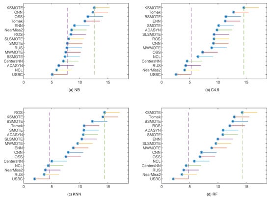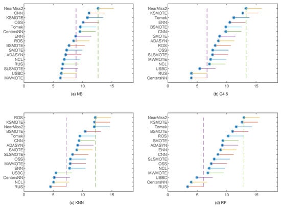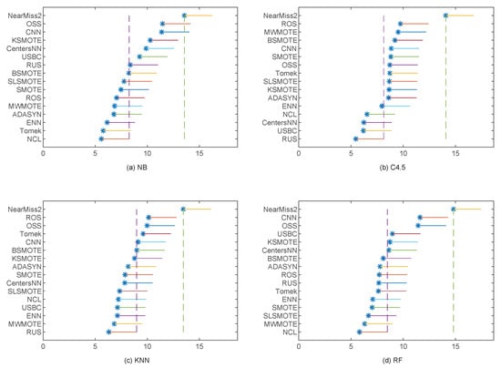 Figure 12 shows the results of the Nemenyi test at a 0.05 significance level with G-Mean as the classification performance measure. We can observe from Figure 12 that RUS obtained the first rank for the two classification algorithms KNN and RF, which significantly outperformed 12 and 13 sampling methods, respectively. However, MWMOTE and CentersNN performed best for NB and C4.5, respectively. To be specific, MWMOTE performed significantly better than seven sampling methods for NB, while CentersNN performs significantly better than 13 sampling methods for C4.5. Furthermore, for the three classification algorithms NB, C4.5, and RF, NearMiss2 obtained the worst G-Mean performance and at least 12 sampling methods performed significantly better than NearMiss2. For KNN, ROS was the worst, with 12 sampling methods performing significantly better than ROS. As a matter of fact, in Figure 12, the corresponding ranks of the different sampling methods generally vary with the different classification algorithms.