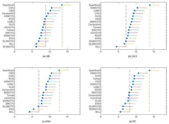 In Figure 11, the corresponding Nemenyi test results with a 0.05 significance level for the F-Measure are provided in detail for each employed classification algorithm. It can be observed from Figure 11 that NCL ranked first for the three classification algorithms, while MWMOTE performed best for the remaining classification algorithm. To be specific, NCL performed significantly better than 14 sampling methods for C4.5, 13 sampling methods for KNN, and 8 sampling methods for RF. However, for NB, MWMOTE only significantly outperformed five sampling methods. Furthermore, for all the classification algorithms employed, NearMiss2 always obtained the worst F-Measure performance. Almost all the other 13 employed sampling methods performed significantly better than NearMiss2, except for OSS with KNN. What is more, the corresponding ranks of the different sampling methods usually varied with different classification algorithms.