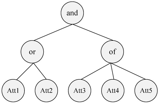 Based on , the access structure tree T is defined to depict the access structure. In the access structure tree T, the root node represents a secret value, non-leaf nodes other than the root node represent thresholds, and leaf nodes represent attributes. The thresholds of non-leaf nodes are divided into three types: “and”, “or”, and “of”, where n is the number of children of the non-leaf nodes and t is the threshold. When , the non-leaf node indicates the threshold “and”. When , the non-leaf node indicates the threshold “or”. When , the non-leaf node indicates the threshold “of”. The secret value of the root node can be obtained if and only if the attributes in the attribute set meet the entire access structure tree.