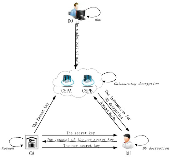 - Central Authority (CA): The CA is a fully trusted entity that performs any assigned tasks according to the protocol specifications and generates the correct output. It is in charge of generating the secret key for the DU and CSPA, as well as generating the new secret key for the DU based on the attribute set.