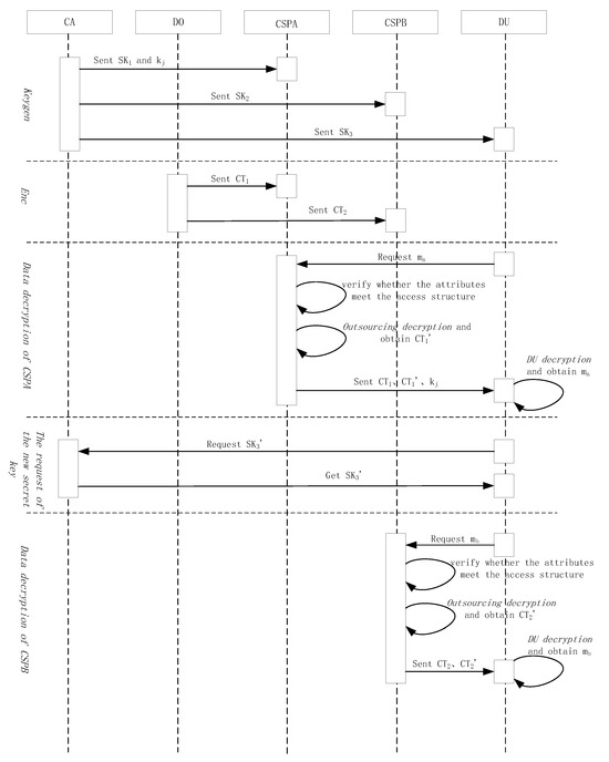- Data Owner (DO): The DO is a party that possesses large amounts of data to be uploaded to the cloud side. It is in charge of defining the access structure and, then, generating the ciphertext of the data. In addition, it is also responsible for dividing the entire data. The DO’s entire data are divided into two parts based on their level of security, which are encrypted and then sent to CSPA and CSPB, respectively.