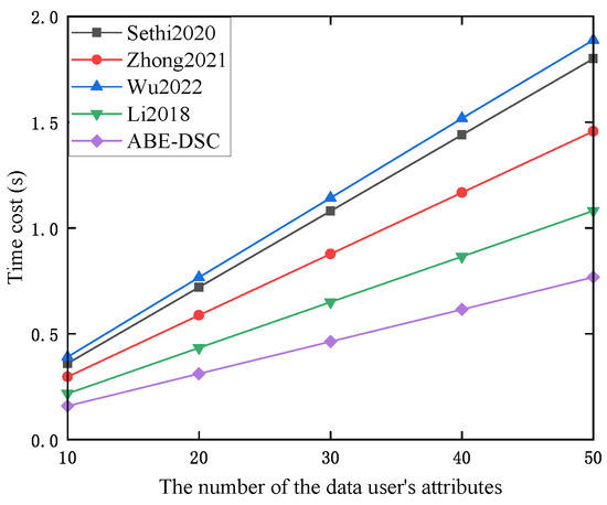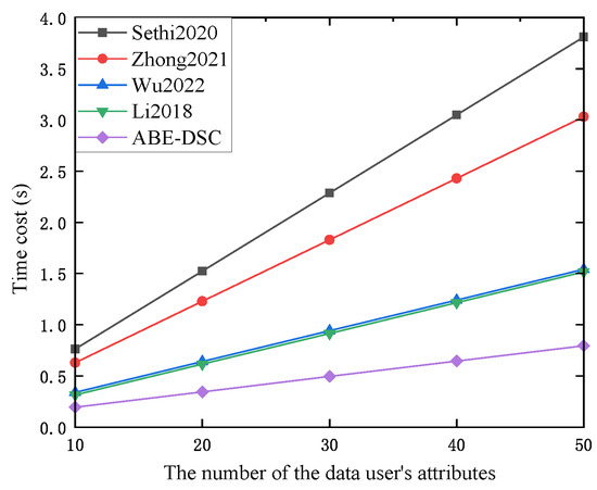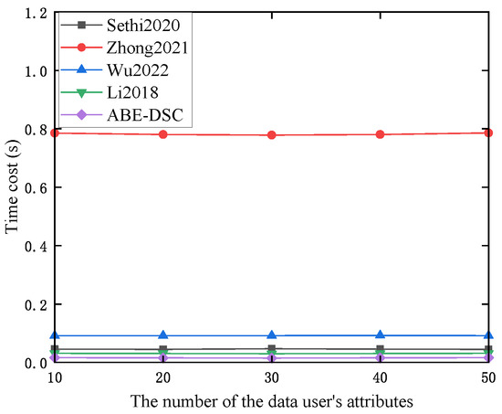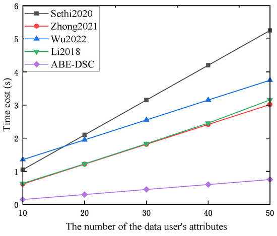 Figure 5 shows the time cost of ABE-DSC and the schemes in [5,6,7,8] during the phase. As Figure 5 shows, the time cost during the phase was almost constant and did not increase with the number of the DU’s attributes. Due to the additional process of assigning a parameter to each attribute in the scheme in [6], the computational overhead of was greater than that of the other existing schemes. Therefore, the time cost of the scheme in [6] was much greater than that of the other schemes in this phase. Assume that there are three authorizations (i.e., the minimum of authorizations) in the scheme in [7]. These authorizations participate in the phase, which resulted in the greater computational overhead of and consumed more time compared to the schemes in [5,8] and ours. Compared to the schemes in [5,8], ABE-DSC had a smaller computational overhead for , and the time cost of ABE-DSC was less than those of the schemes in [5,8]. In other words, compared to the schemes in [5,6,7,8], ABE-DSC consumed less time in this phase.