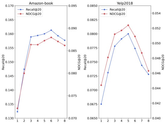 - KGCN [18]: A collaborative recommendation model based on a graph convolutional neural network, which leverages high-order dependencies in the knowledge graph to mine users’ latent features.