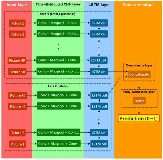 The CNN–RNN model comprised a total of eight layers, including two input layers, two time-distributed layers (each consisting of four convolution layers, three max-pooling layers, and one flatten layer), two LSTM layers (long short-term memory), one concatenate layer, and one dense layer. Figure 1 illustrates the overall structure of the CNN–RNN model. As depicted in the figure, the CNN–RNN model could be divided into four parts in order: the input layer, the time-distributed layer, the LSTM layer, and the final part used to generate prediction. The time-distributed layer included several convolutional layers and maximum-pooling layers, which constituted the “CNN” part of the CNN–RNN model, while LSTM constituted the “RNN” part of the model. The anterior–posterior and lateral views of the DSA series were processed separately. Thereafter, the concatenate layer combined the results from both views and passed the information to the fully connected layer to generate the prediction, which ranged from 0 to 1.