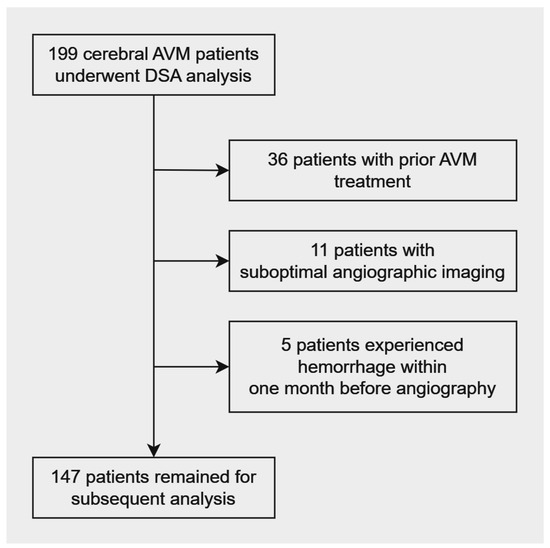 - Lin, T.M.; Yang, H.C.; Lee, C.C.; Wu, H.M.; Hu, Y.S.; Luo, C.B.; Guo, W.Y.; Kao, Y.H.; Chung, W.Y.; Lin, C.J. Stasis index from hemodynamic analysis using quantitative DSA correlates with hemorrhage of supratentorial arteriovenous malformation: A cross-sectional study. J. Neurosurg. 2020, 132, 1574–1582. [Google Scholar] [CrossRef]