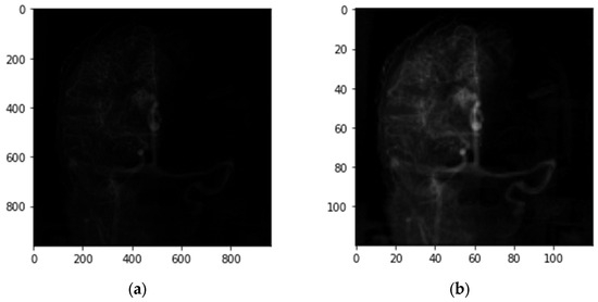 Before we trained the neural network, we preprocessed the data by enhancing the contrast of each image. We multiplied the pixel values of the images in each DSA series by a certain value, so that the maximal pixel value of each DSA series was equal to 255. Owing to the RAM constraint on Google Collaboration, we reshaped the images from 960 × 960 to 120 × 120. Figure 3 shows the representative images before preprocessing (a) and after preprocessing (b). The original image (a) was from the radiology system in Taipei Veterans General Hospital.
