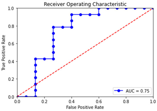 Given the recent success of implementing AI in medical imaging [19,20,21,22,23,24], we assessed the feasibility of using neural network analysis of DSA to generate results that are comparable to traditional assessment methods based on angioarchitecture. Owing to the dynamic nature of DSA in medical imaging, we devised a CNN–RNN model structure. Fine-tuning of the model’s hyperparameters was conducted to minimize the decreased accuracy from our training set to test set, including the learning rate, number of layers, neurons, and filters. We also experimented with the inclusion or exclusion of normalization layers, activation layers, and dropout layers. Although we were unable to completely eliminate the issue of overfitting, we achieved a relatively favorable outcome when compared to the regression model based on angioarchitecture. Our test set yielded an accuracy of 76% and an AUC of 0.75, while angioarchitecture-based analysis yielded an accuracy of 69% and an AUC of 0.76 (Figure 4).