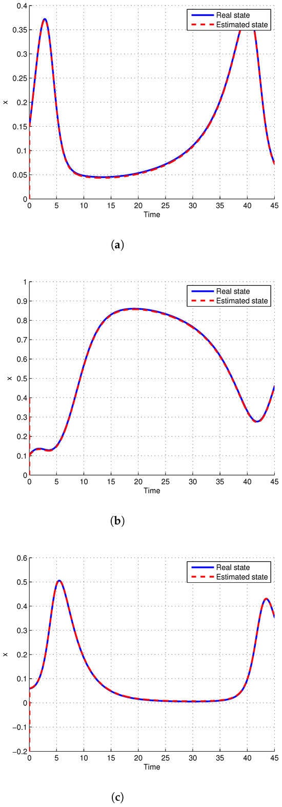 Observer-based synchronization error using Ref. [] method (a) , (b) , (c) .