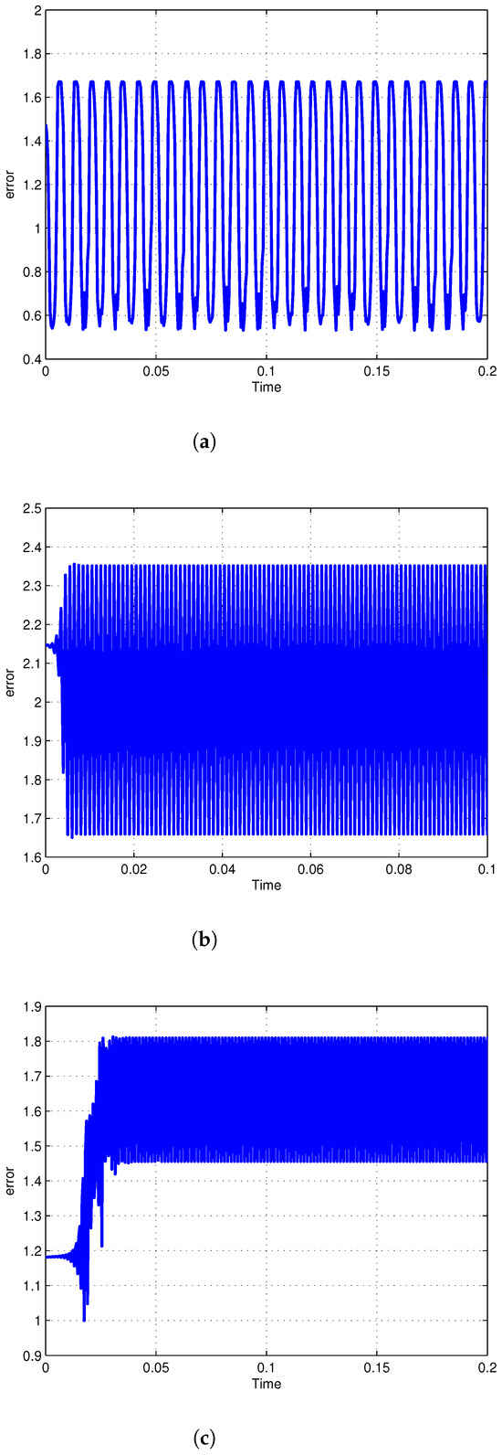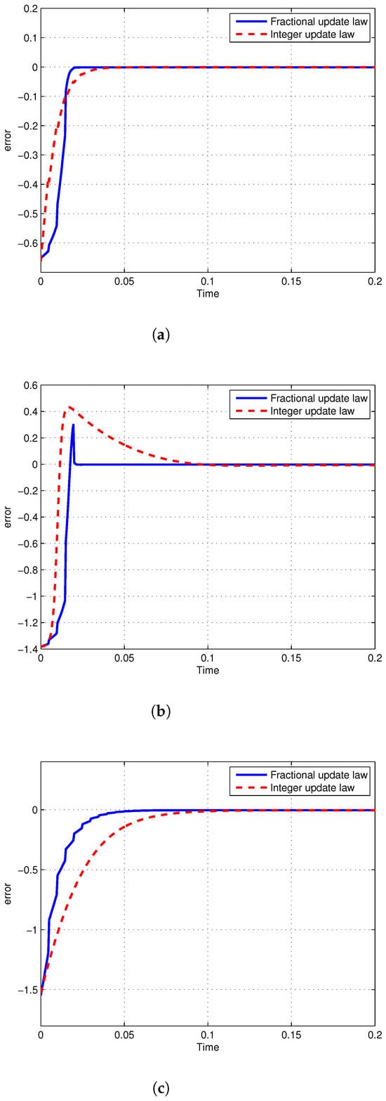 We simulate this example with a fractional-order RNN and ANN. In addition, we simulate it with an integer-order RNN. The results of these simulations are shown in Table 3. The observer-based synchronization errors when applying an integer weight matrix update law as in Equation (33) and a fractional weight matrix update law as in Equation (32) are illustrated in Figure 5. As shown in this figure, the fractional update law leads to better results. To make a comparison, we simulate this problem using the approach outlined in []. This paper uses a type 2 active control method to design the observer for synchronization. This network has a feedforward structure without any complexity. The errors of synchronization when applying this method to the considered case study are shown in Figure 6, which shows that it cannot achieve the observer-based synchronization of fractional-order systems.