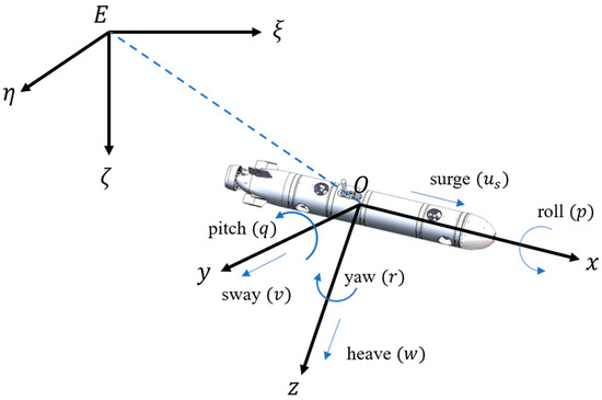 where is the inertial matrix, is the Coriolis and centripetal matrix, is the hydrodynamic damping matrix, and is the hydrostatic force and moment. is the AUV’s control vector, where is the stern thruster force, is the vertical plane deflection, and is the translational plane deflection. is the active control force in the AUV’s motion coordinate system . is the external disturbance. represents the disturbance brought by parametric uncertainties [10].