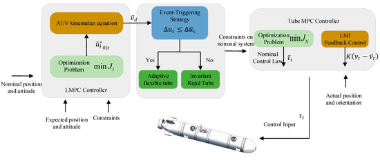 In order to address the external ocean current disturbance and parametric uncertainties of the Coriolis and centripetal matrix and the hydrodynamic damping matrix, a tube-based event-triggered path-tracking strategy consisting of a LMPC controller and a tube MPC controller is developed. The scheme of the proposed path-tracking strategy is shown in Figure 2.