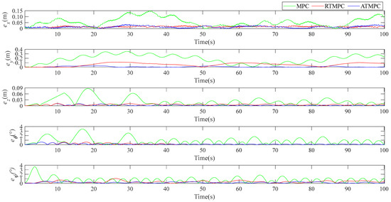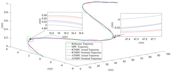 Intuitive path-tracking performance can be visualized in the trajectory of AUV during path tracking, which is the position of the AUV given in Section 3.1. Figure 3 shows a three-dimensional view of the AUV’s path-tracking control performance of “MPC”, “RTMPC”, and “ATMPC”. The trajectory of “MPC” fails to track the reference trajectory well. Although the path-tracking deviation of “MPC” tends to converge, there are still several obvious position offsets, especially at the beginning of path tracking. Actual trajectories of both “RTMPC” and “ATMPC” can separately track the nominal trajectory. Note that the nominal trajectory of “ATMPC” tracks the reference trajectory better, compared with that of “RTMPC”.